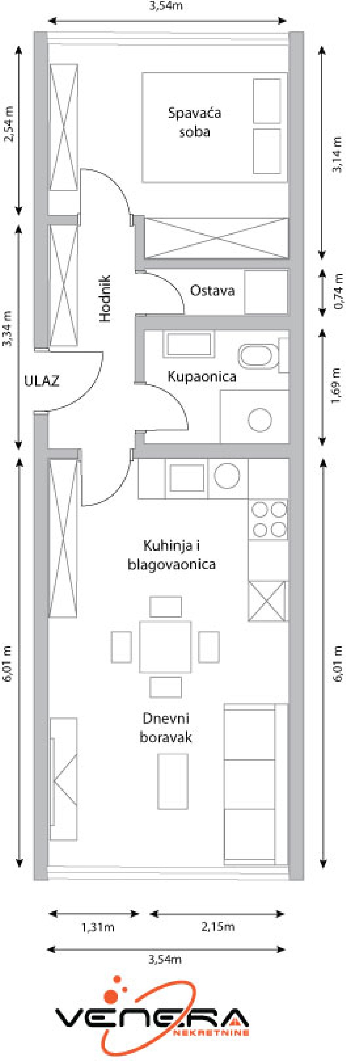 Stan se sastoji od: ulaznog prostora, odvojene spavaće sobe, kupaonice sa wc-om, vešeraja (za sušilicu i perilicu), kuhinje te dnevnog boravka sa blagovaonicom.
